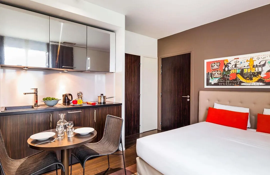 Adagio Serris Val D'Europe hotel offers rooms with a kitchen and a dining area featuring an ironing set and an air conditioner, along with complimentary Wi-Fi and a flat-screen TV with satellite channels. Bathroom comforts include a hairdryer and towels, and such essentials as a roll-in shower, a separate toilet, and a sink.